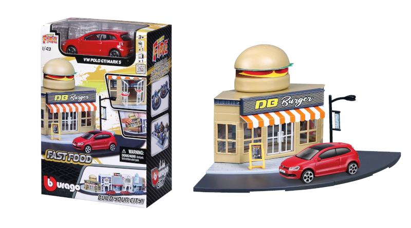 Wprowadzenie » ZABAWKI NA MIKOŁAJKI » Auto VW Polo metalowe 10cm city fast food zestaw 1:43 Bburago