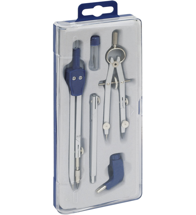 5 elementów w zestawie: cyrkiel 136 mm, zerownik, końcówka cyrkla z uchwytem uniwersalnym, przedłużacz, wymienny grafit