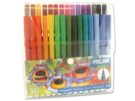 Zestaw 30 flamastrów w plastikowym etui w kształcie walizeczki. Flamastry z cienką końcówką o średnicy 2 mm. Tusz na bazie wody. Żywe, intensywne kolory. Flamastry MILAN są zgodne z europejskimi i amerykańskimi normami bezpieczeństwa. Nie zawierają ftalanów, metali ciężkich i innych substancji toksycznych. Są bezpieczne dla dzieci.