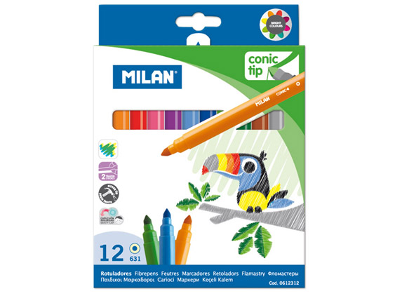 Flamastry z wytrzymałą i elastyczną stożkową końcówką o średnicy 5 mm, która nie wpada do środka nawet przy silnym nacisku. Po chwilowym odkształceniu końcówka zawsze wraca do pierwotnego kształtu. Pozwala na rysowanie cienkich i grubych linii (od 3 mm do 0,75 cm). Tusz na bazie wody. Żywe, intensywne kolory. Wentylowana skuwka. Flamastry MILAN są zgodne z europejskimi i amerykańskimi normami bezpieczeństwa. Nie zawierają ftalanów, metali ciężkich i innych substancji toksycznych. Są bezpieczne dla dzieci