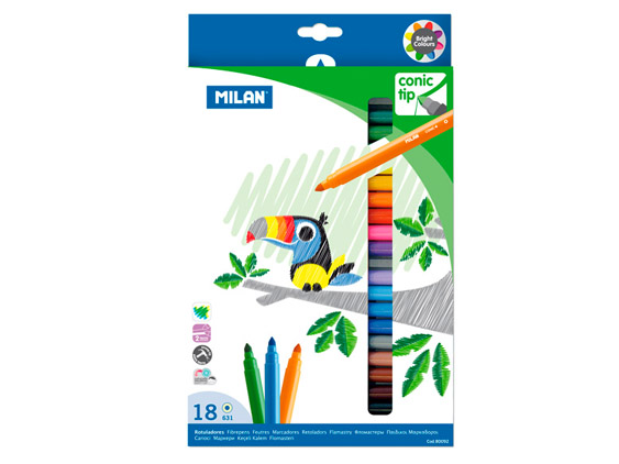 Flamastry z wytrzymałą i elastyczną stożkową końcówką o średnicy 5 mm, która nie wpada do środka nawet przy silnym nacisku. Po chwilowym odkształceniu końcówka zawsze wraca do pierwotnego kształtu. Pozwala na rysowanie cienkich i grubych linii (od 3 mm do 0,75 cm). Tusz na bazie wody. Żywe, intensywne kolory. Wentylowana skuwka. Flamastry MILAN są zgodne z europejskimi i amerykańskimi normami bezpieczeństwa. Nie zawierają ftalanów, metali ciężkich i innych substancji toksycznych. Są bezpieczne dla dzieci.