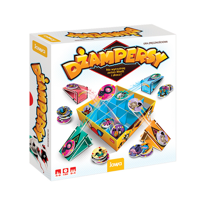 Na wyrzutnię żeton kładź i skacz! Dżampersy to gra zręcznościowa dla 2-4 graczy w wieku od lat 4. Każdy zawodnik otrzymuje wyrzutnię i żetony. Wygrywa dżampers, który wrzuci do pudełka więcej żetonów i zdobędzie najwięcej punktów. Instrukcja zawiera sześć różnych propozycji rozgrywek.