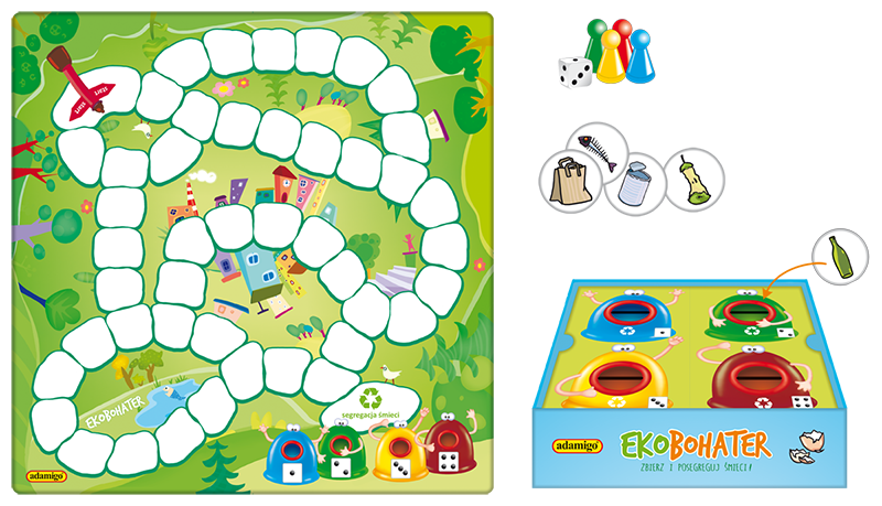 EKOBOHATER to gra, która zapewni całej rodzinie świetną zabawę i zachęci do dbania o środowisko! Zadaniem graczy jest zebranie z planszy różnego rodzaju śmieci np.: puszek, starych gazet, butelek, plastikowych opakowań.