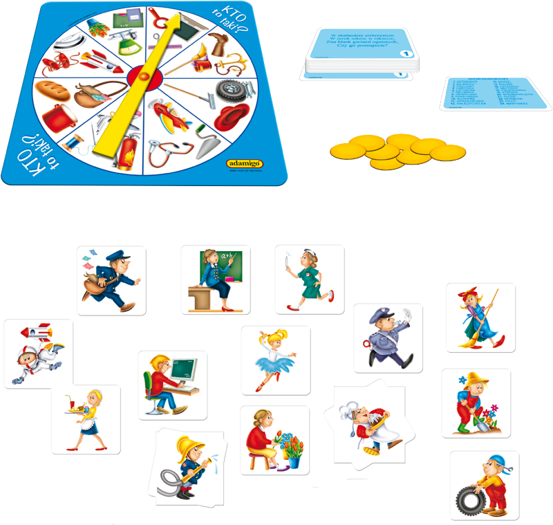 „Kto to taki” to gra, która w fantastyczny sposób umożliwia poznawanie zajęć i zawodów ludzi. Bazuje na motywie skojarzeń, za pomocą których Twój maluch poproszony zostanie o dopasowanie zawodu do charakterystycznego rekwizytu, który jest jego nieodłącznym elementem.