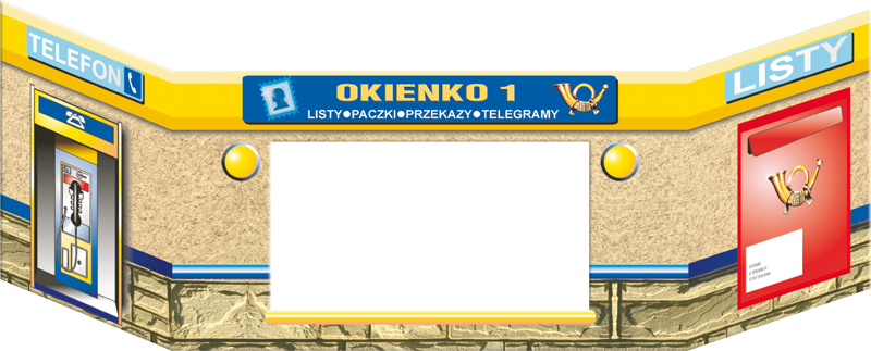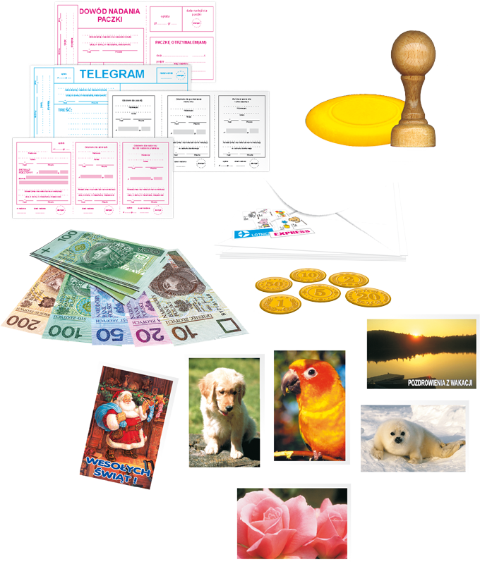 okienko pocztowe, banknoty, koperty, monety, druki pocztowe, różne rodzaje znaczków, kilkanaście rodzajów pocztówek i kart pocztowych.