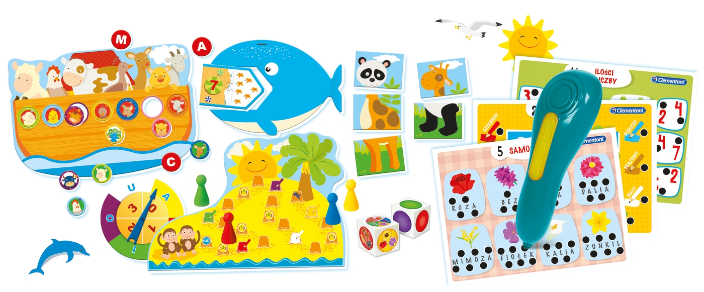 - Obszerny zestaw umożliwiający naukę przez zabawę z mówiącym długopisem.