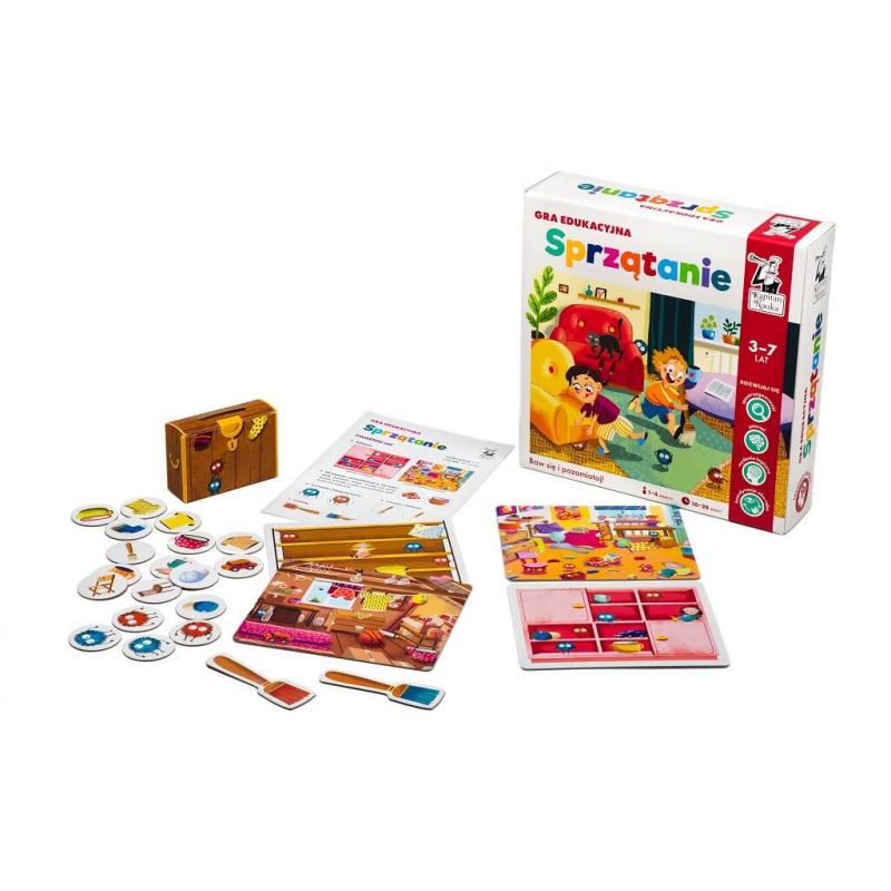 Gra Sprzątanie to pełna humoru gra dla przedszkolaków, dzięki której zaczną kojarzyć porządkowanie z wesołą zabawą, a nie obowiązkiem. Gra udoskonali myślenie logiczne, pamięć, spostrzegawczość i refleks. Proste zasady oraz trzy warianty rozgrywki umożliwią rywalizację z innymi graczami, kooperację, a nawet grę w pojedynkę.