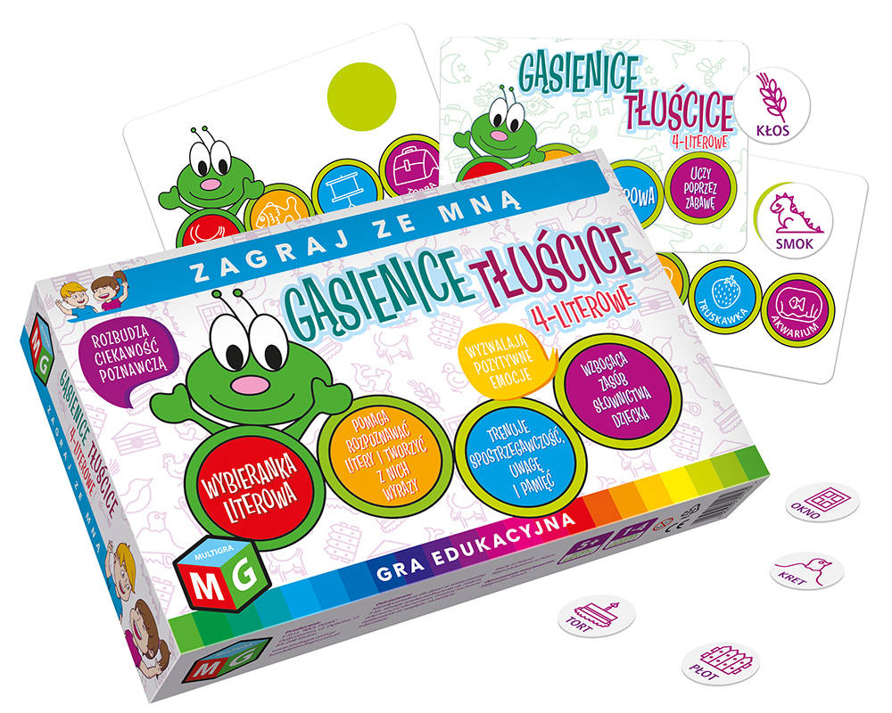 Gąsienice tłuścice to gra dydaktyczna, która uczy dzieci tworzenia 4-literowych wyrazów, usprawnia analizę i syntezę fonemową oraz spostrzegawczość wzrokową. Zabawa polega na wybieraniu przez dziecko pierwszych liter z nazw obrazków prezentowanych przez gąsienice i tworzeniu z nich wyrazów. Proste i miłe dla oka rysunki ułatwiają poprawne rozpoznawanie i tworzenie słów. Gra ćwiczy rozróżnianie i identyfikowanie liter.