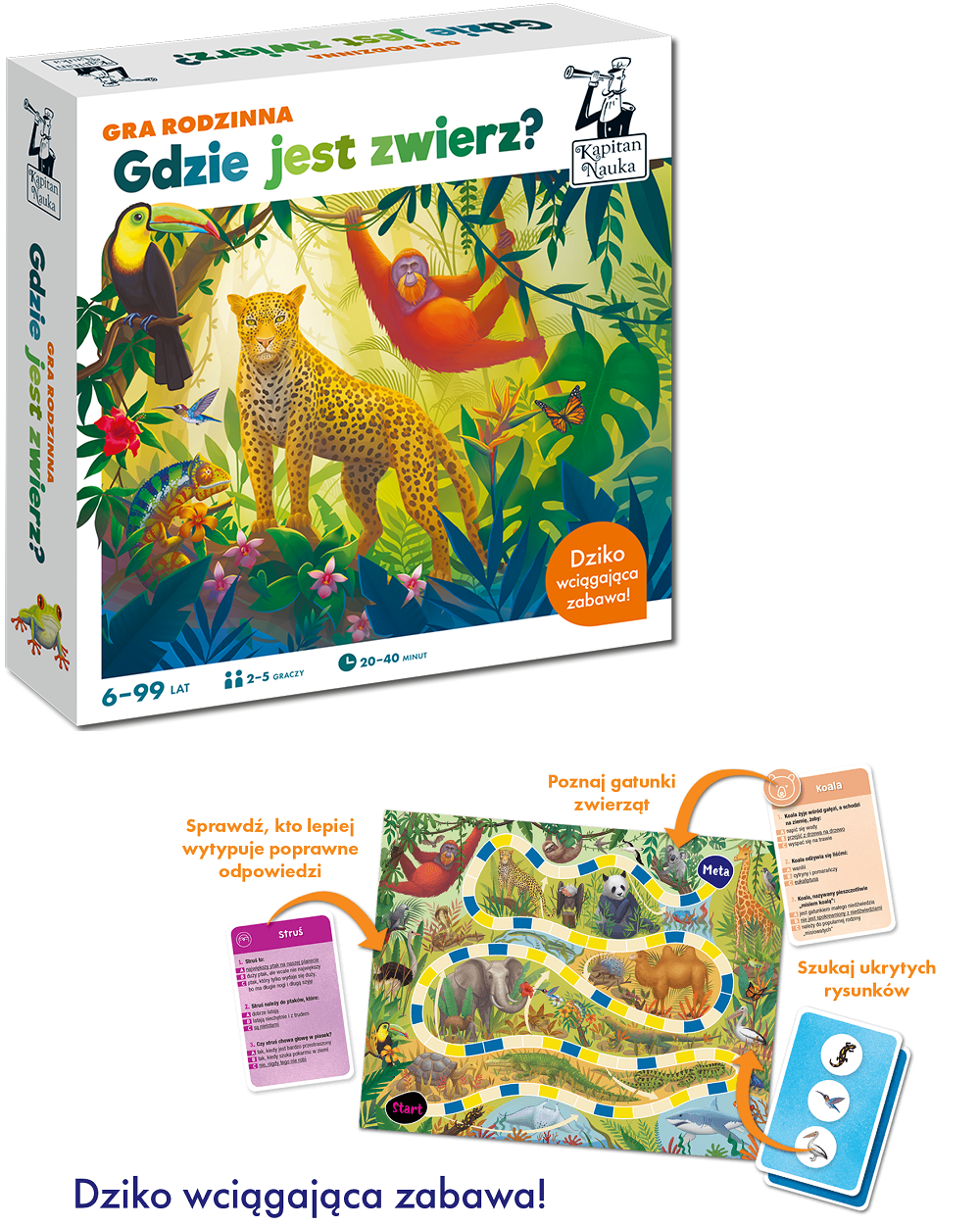 Gdzie jest zwierz? to rodzinna gra planszowa, która zapewni szalony wyścig w świecie zwierząt. Sprawdźcie, co wiecie o różnych gatunkach, poznajcie zwierzęcych rekordzistów oraz ciekawostki dotyczące ich życia. Typujcie poprawne odpowiedzi na pytania quizowe i szukajcie na planszy ukrytych zwierzaków.
