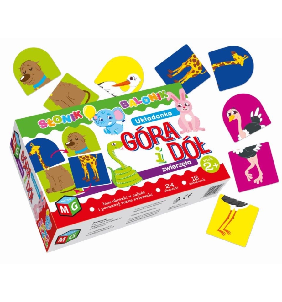 Układanka Góra i dół zwierzęta to przyjemna zabawa dla maluchów i ich rodziców. Układaj uśmiechnięte zwierzaki, pamiętaj tylko, żeby się nie pomylić!