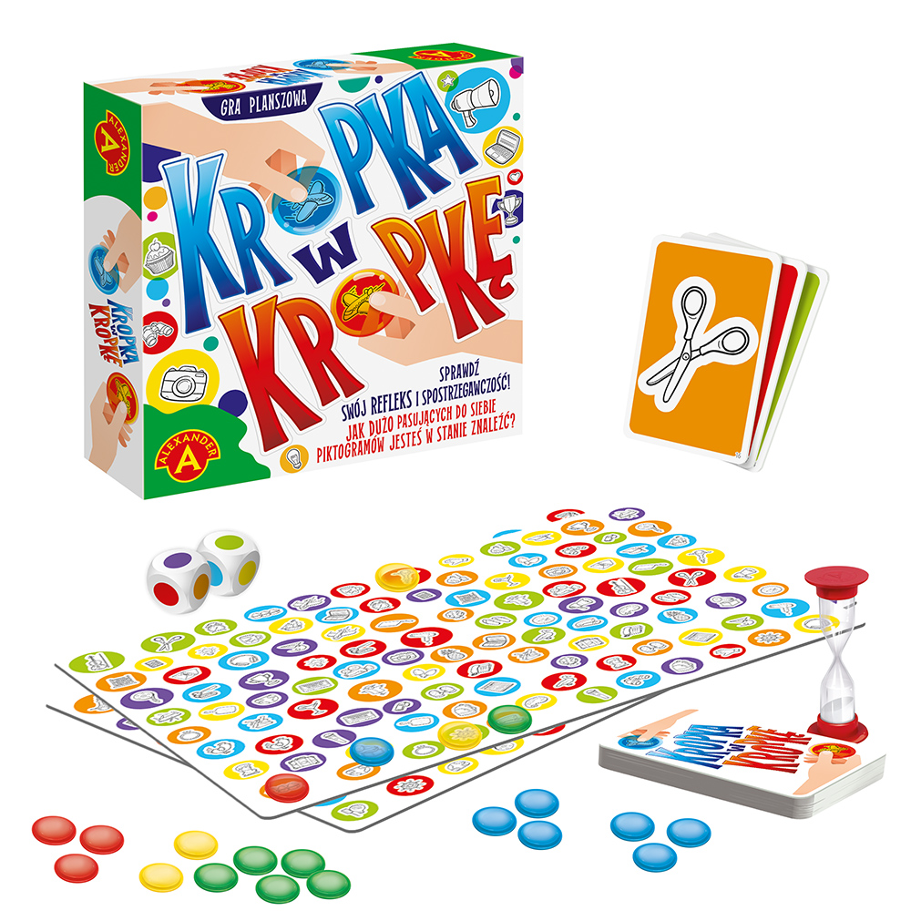 Świetna gra na spostrzegawczość, którą pokocha każde dziecko, co więcej z łatwością ogra rodziców. Zabawa polega na odnajdowaniu kolorowych piktogramów, ale w różnych kolorach wskazanych przez kostki. Poszukiwania odbywają się na planszach, na których mieni się aż od kolorów i znaków. Kto z Was ma najbardziej wprawne oko? Dwa warianty rozgrywki.