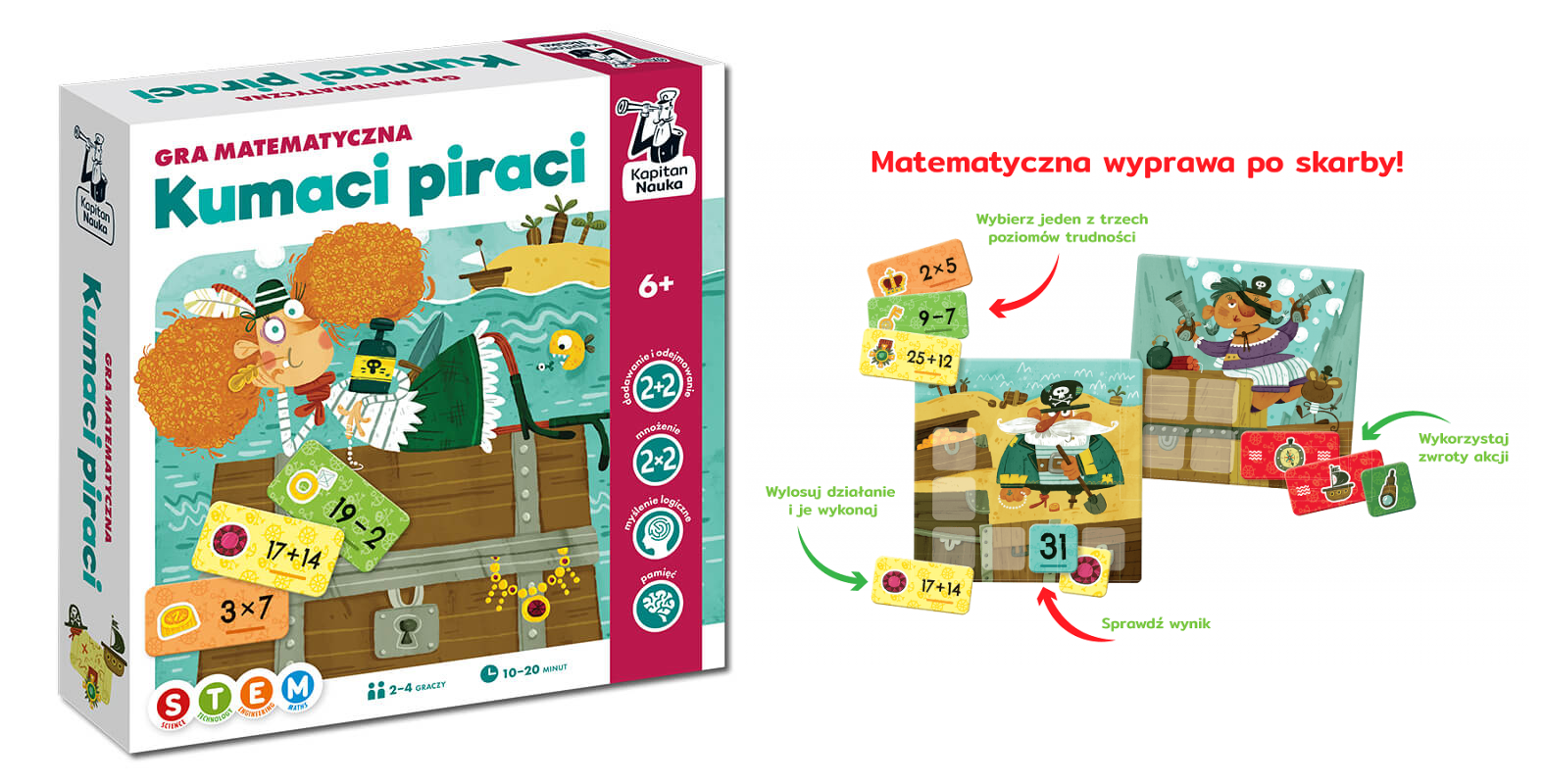 Ile jest 4x5, a 18+2? Wylosujcie działanie, wykonajcie je i sprawdźcie wynik! Podpowiedź będą stanowiły pirackie trofea – jeśli są takie same na żetonie i planszy – zbieracie skarb. Wygrywa ten, kto pierwszy zgromadzi sześć pirackich trofeów i umieści je w skrzyni.