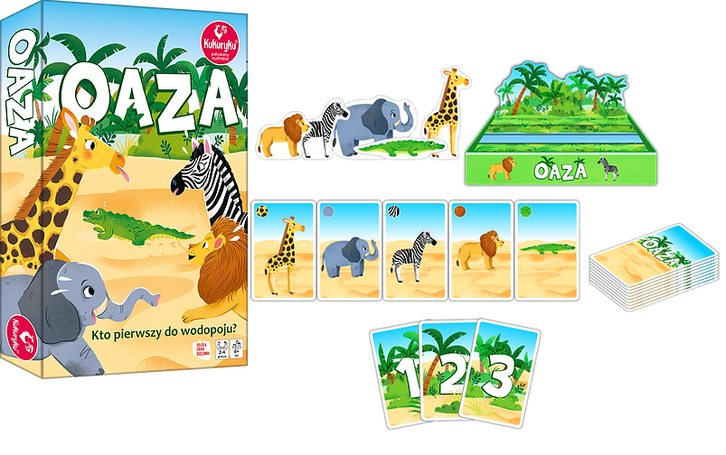 Wszystkie zwierzęta chcą dostać się do wodopoju. Które dotrze tam jako pierwsze? Podczas gry będziecie zmieniali kolejność zwierząt w wyścigu do OAZY oraz będziecie starali się wytypować te z nich, które dotrą tam najszybciej.