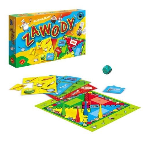 "Poznajemy zawody" to atrakcyjna i emocjonująca gra dla młodszych dzieci. Każdy z graczy wybiera pionek, który reprezentuje w grze jeden z czterech zawodów: policjanta, rolnika, lekarza i kucharza. W czasie rywalizacji na torze gry, gracz musi uzbierać i ułożyć części swojej układanki. Na każdej z tych części jest obrazek przedstawiający narzędzie pracy używane w zawodzie wybranym przez gracza. W trakcie zmierzania do celu gry wiele satysfakcji daje dzieciom zdobywanie i układanie poszczególnych puzzli, a namalowane na nich narzędzia pracy przybliżają informacje o reprezentowanych zawodach. Gra "Poznajemy zawody" zapewni mnóstwo emocji, radości i satysfakcji nie tylko zwycięzcom.