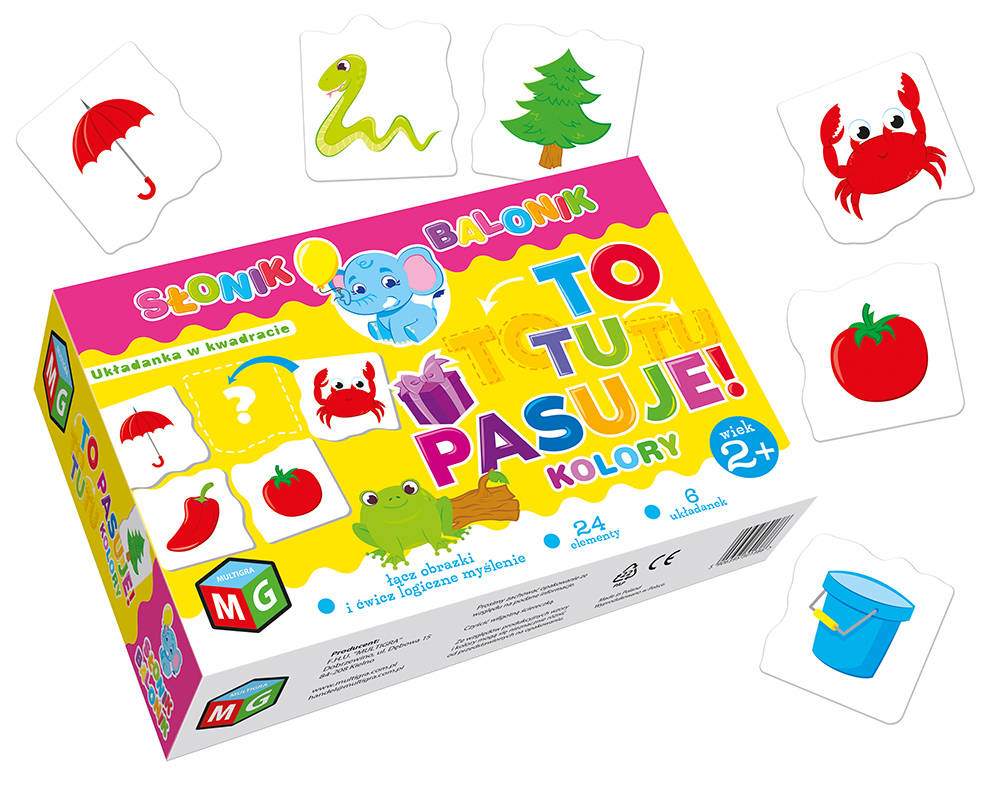 Słonik Balonik wychodzi naprzeciw potrzebom najmłodszych. Dzięki zastosowaniu dużych elementów z wysokiej jakości grubej tektury, dzieci z łatwością je chwytają, ćwicząc małą motorykę. Kolorowe obrazki rozbudzają w maluchach wyobraźnię, a zróżnicowane zadania świetnie wpływają na ich rozwój. „TO TU PASUJE! - KOLORY” to kolorowa układanka dla najmłodszych. Jest ona doskonałym sposobem na trening logicznego myślenia i grupowania obrazków według koloru. Wspólna zabawa pogłębia wzajemną więź między dorosłymi a maluchami. Dziecko ćwiczy podczas zabawy logiczne myślenie i łączenie różnych obrazków w jeden zbiór. Wszystkie elementy wykonane są z wygodnej dla rączek maluchów, grubej tektury. Układanie poszczególnych części jest doskonałym treningiem podstawowej motoryki.