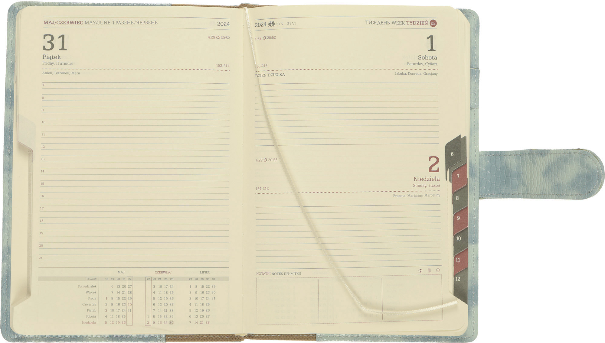 - w dolnej części strony skrócone kalendarium miesięczne notes, skorowidz tele-adresowy miejsce na długopis, tasiemka, mapa