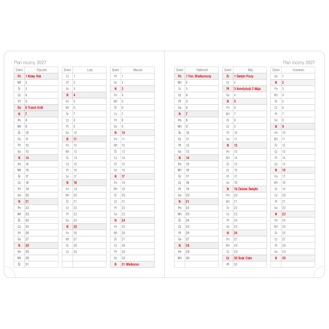 • skrócony kalendarz bieżącego i następnego miesiąca na każdej rozkładówce