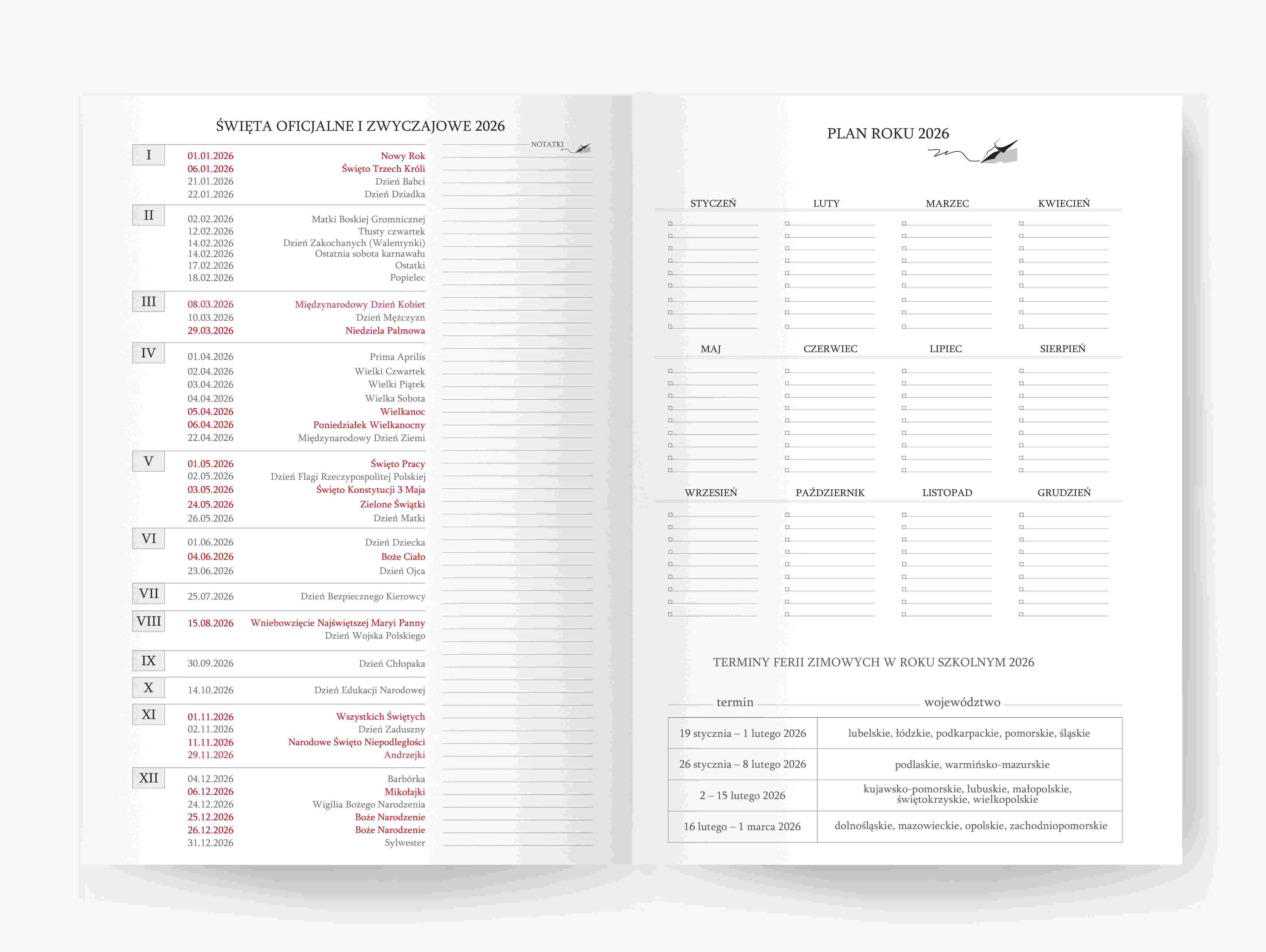 • wewnątrz: plan roku i rozkład roku 2026, terminy ferii zimowych, święta oficjalne i zwyczajowe, podróże, protokół powypadkowy w przypadku stłuczki, notes, skorowidz teleadresowy, kalendarium dodatkowe na 2025-2026-2027 rok
