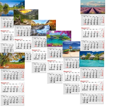 Kalendarz Trójdzielny Lux jest produktem dedykowanym niewielkim firmom – pod kalendariami oferuje przestrzeń na personalizowany przekaz reklamowy wielkości 310x75 mm. Kalendaria zawierają oznaczenia miesięcy i dni tygodnia w trzech językach (PL, EN, DE) oraz imieniny i typowe święta.