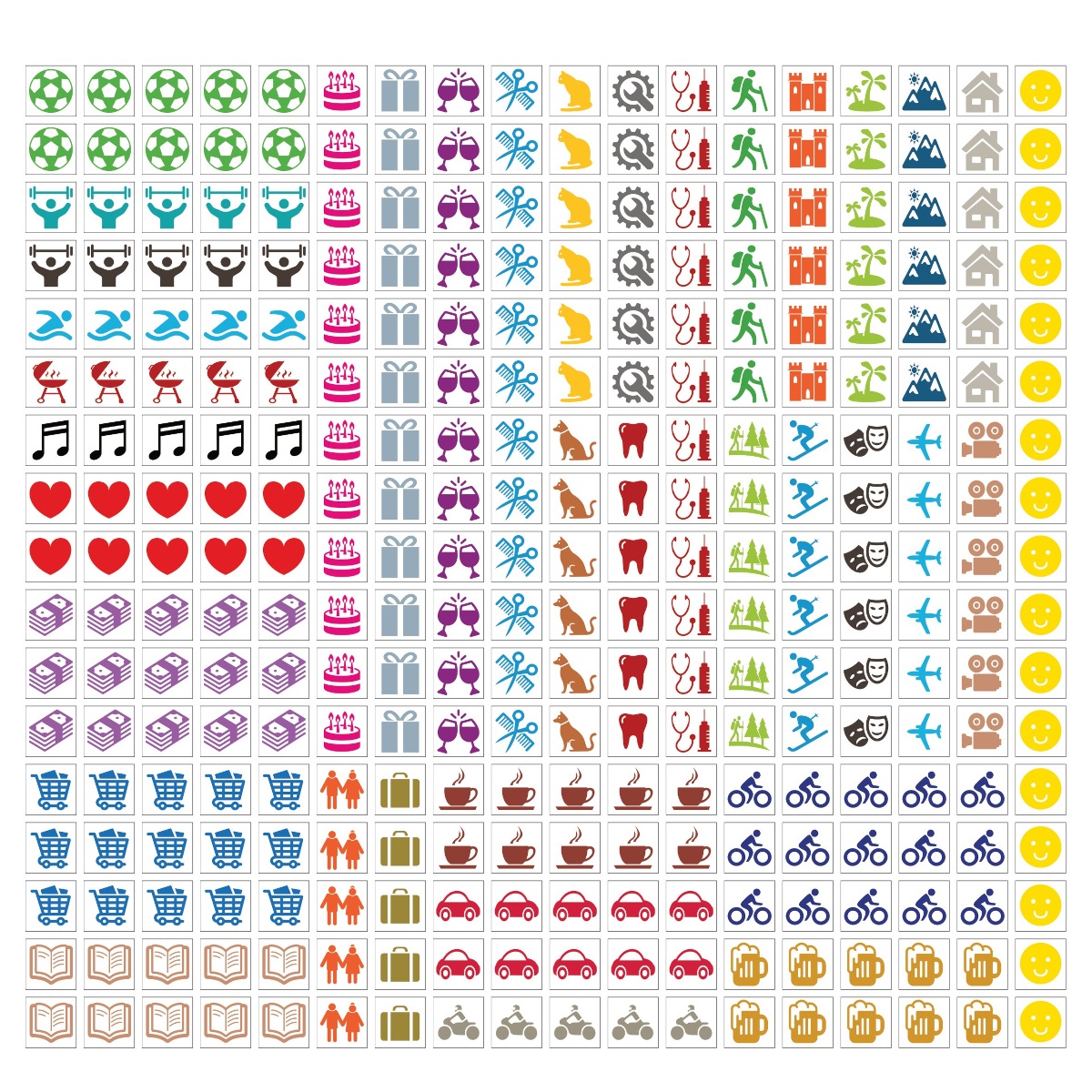 imieniny, urodziny, randka, wakacje, zakupy, dentysta, lekarz, piłka nożna, siłownia, praca, impreza, teatr, muzyka, pies, kot.