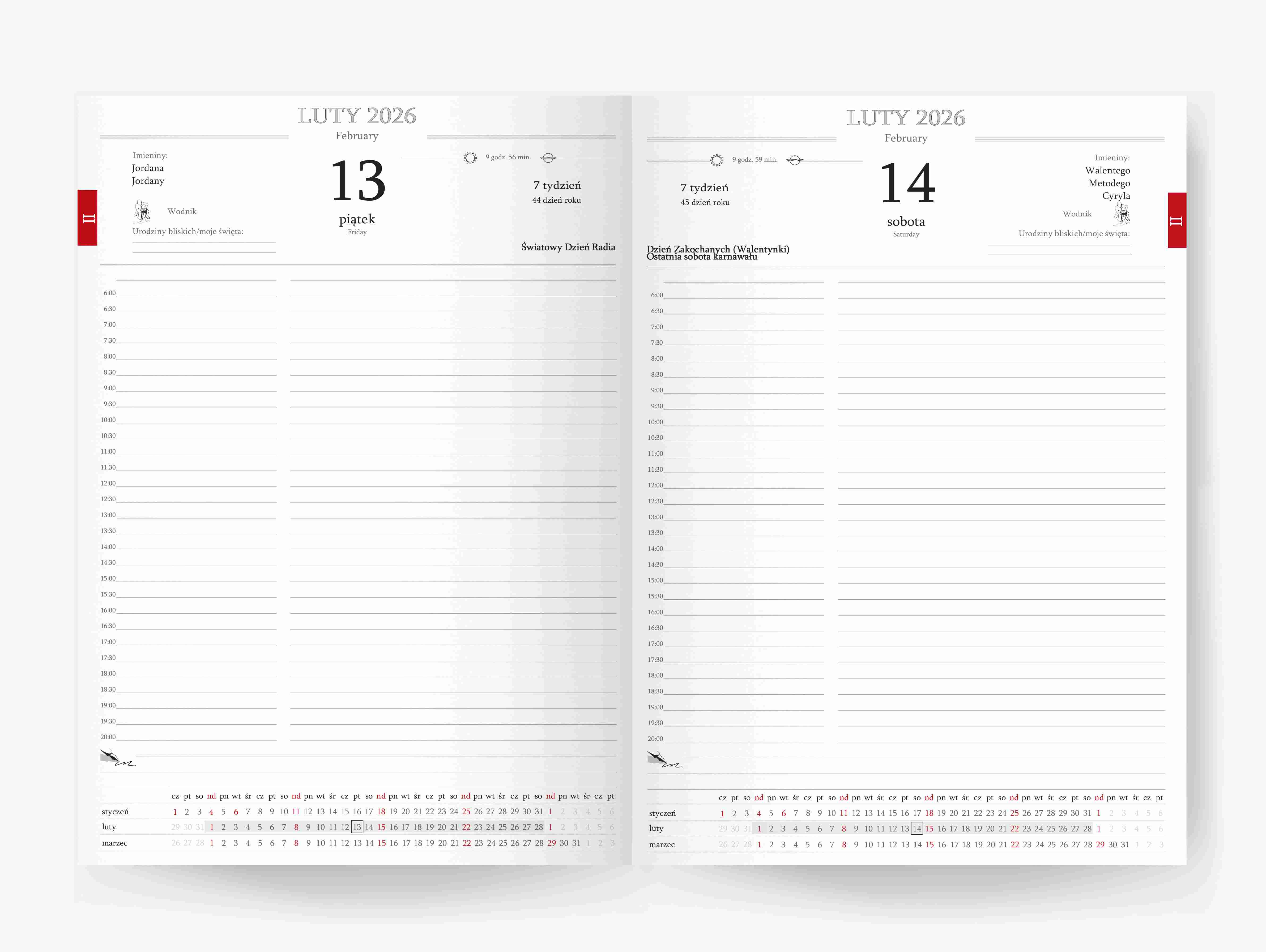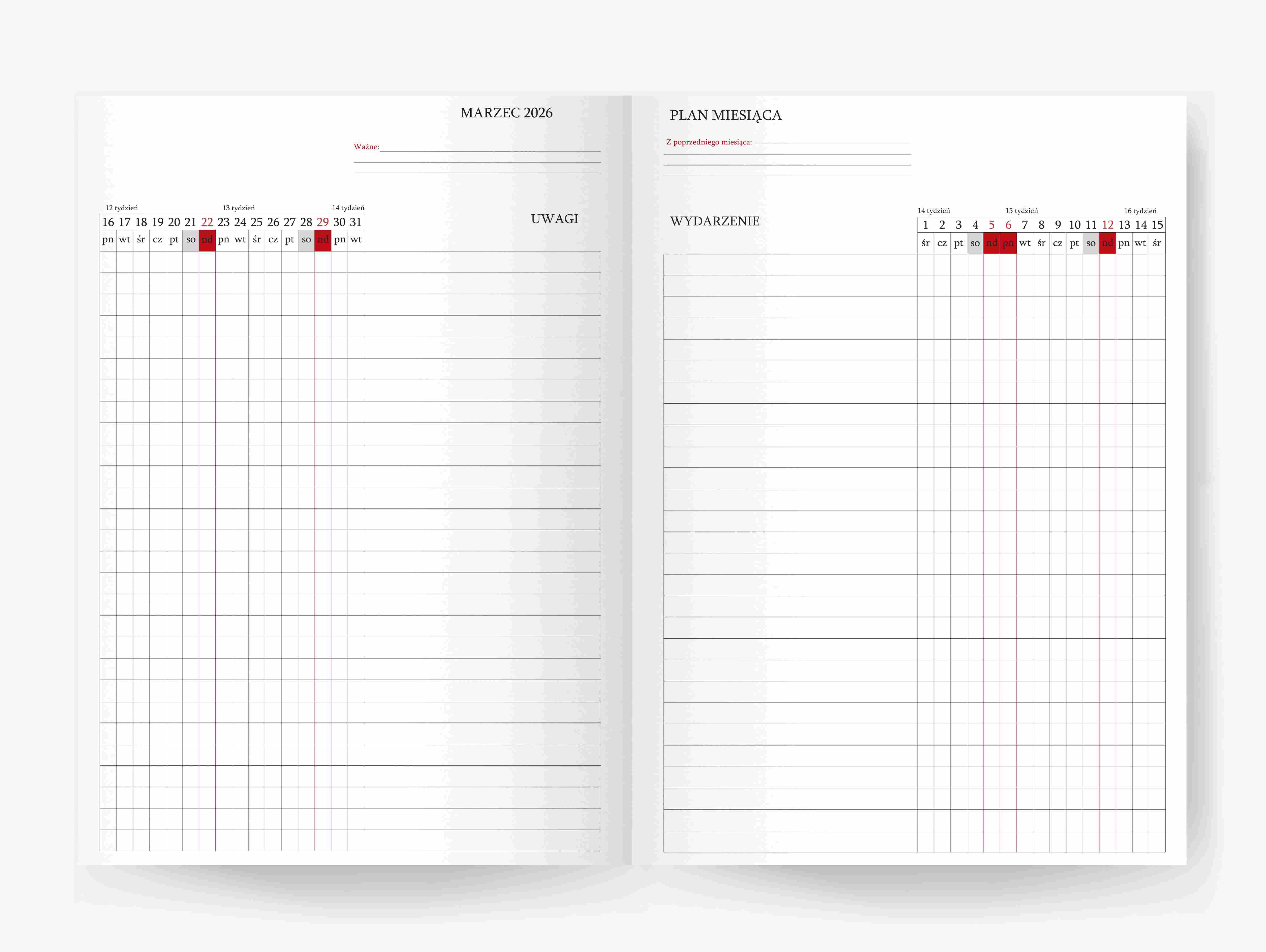 • wewnątrz: plan roku i rozkład roku 2026, specjalny planer do zarządzania zadaniami w czasie(np. planowanie urlopów, wakacji, wizyt klientów, zabiegów itp.) z podziałem na każdy miesiąc osobno, terminy ferii zimowych, święta oficjalne i zwyczajowe, podróże, informacje dla podróżnych, protokół powypadkowy w przypadku stłuczki, notes, skorowidz teleadresowy, kalendarium dodatkowe na 2025-2026-2027