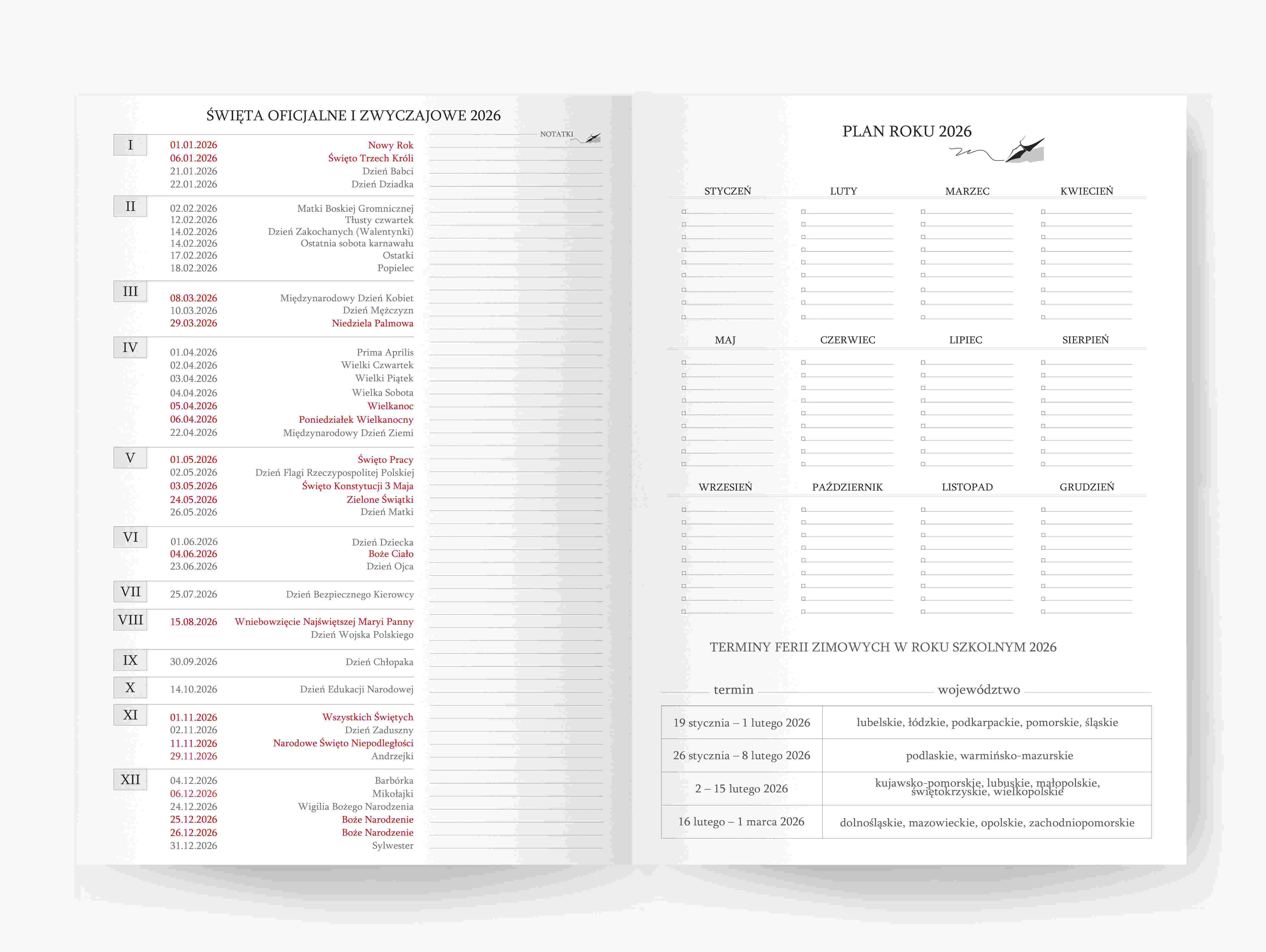 • wewnątrz: plan roku i rozkład roku 2026, specjalny planer do zarządzania zadaniami w czasie(np. planowanie urlopów, wakacji, wizyt klientów, zabiegów itp.) z podziałem na każdy miesiąc osobno, terminy ferii zimowych, święta oficjalne i zwyczajowe, podróże, informacje dla podróżnych, protokół powypadkowy w przypadku stłuczki, notes, skorowidz teleadresowy, kalendarium dodatkowe na 2025-2026-2027