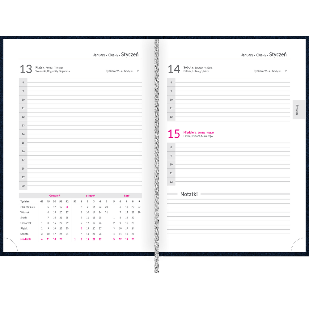 Kalendarz Top 2000 Basic 2026 to niezawodne narzędzie dla tych, którzy cenią klasyczną formę, przejrzystość i wygodę planowania. Dzięki dziennemu układowi stron, każdemu dniu poświęcono osobną stronę, co daje wystarczająco dużo miejsca na notatki, spotkania i listy zadań – zarówno zawodowych, jak i prywatnych. Kalendarz ma poręczny format A5, który świetnie sprawdza się zarówno w biurze, jak i podczas pracy mobilnej. Solidna twarda oprawa pokryta materiałem imitującym skórzaną teksturę nadaje mu profesjonalny wygląd i zwiększa trwałość. Szyto-klejony, brulionowy grzbiet gwarantuje wygodne otwieranie na płasko, a czytelnie oznaczone registry miesięczne ułatwiają szybkie odnajdywanie dat. Zaznaczone święta i ważne dni pomagają w sprawnym planowaniu całego roku. To doskonały wybór dla każdego, kto potrzebuje funkcjonalnego, estetycznego kalendarza w codziennej pracy.