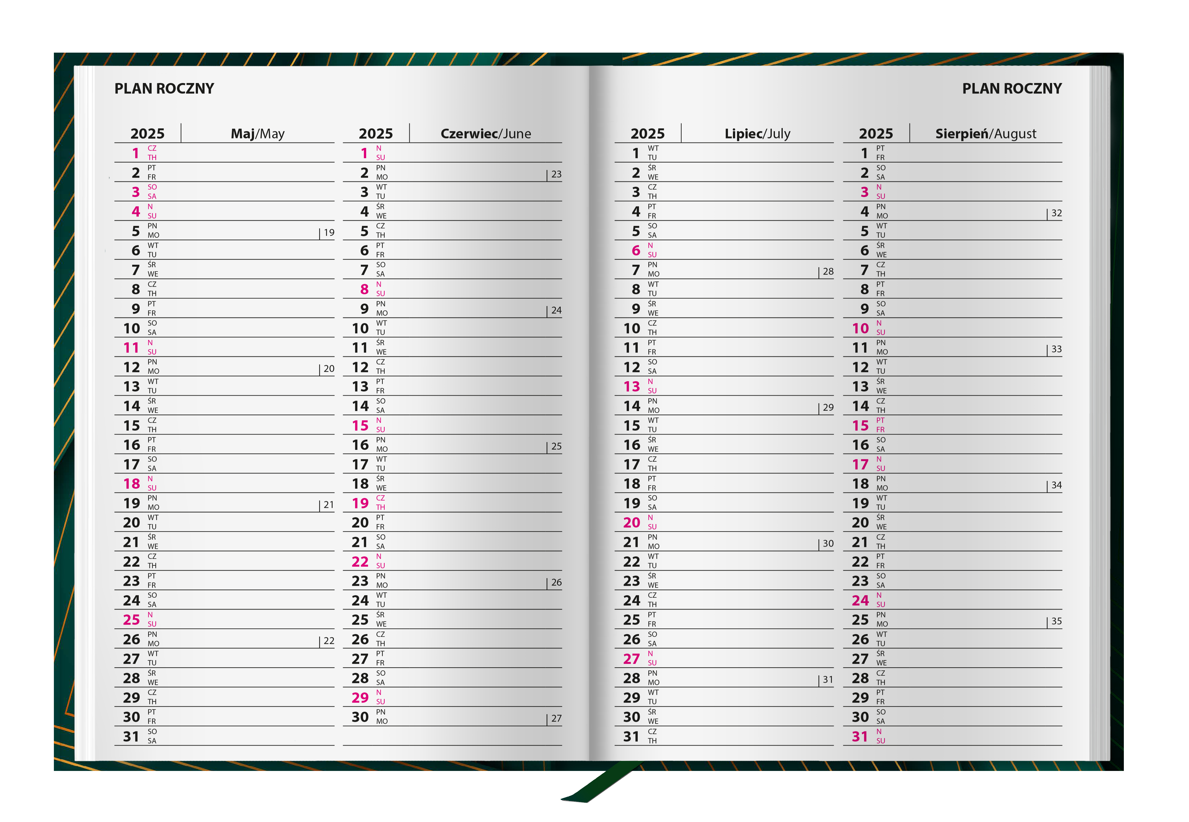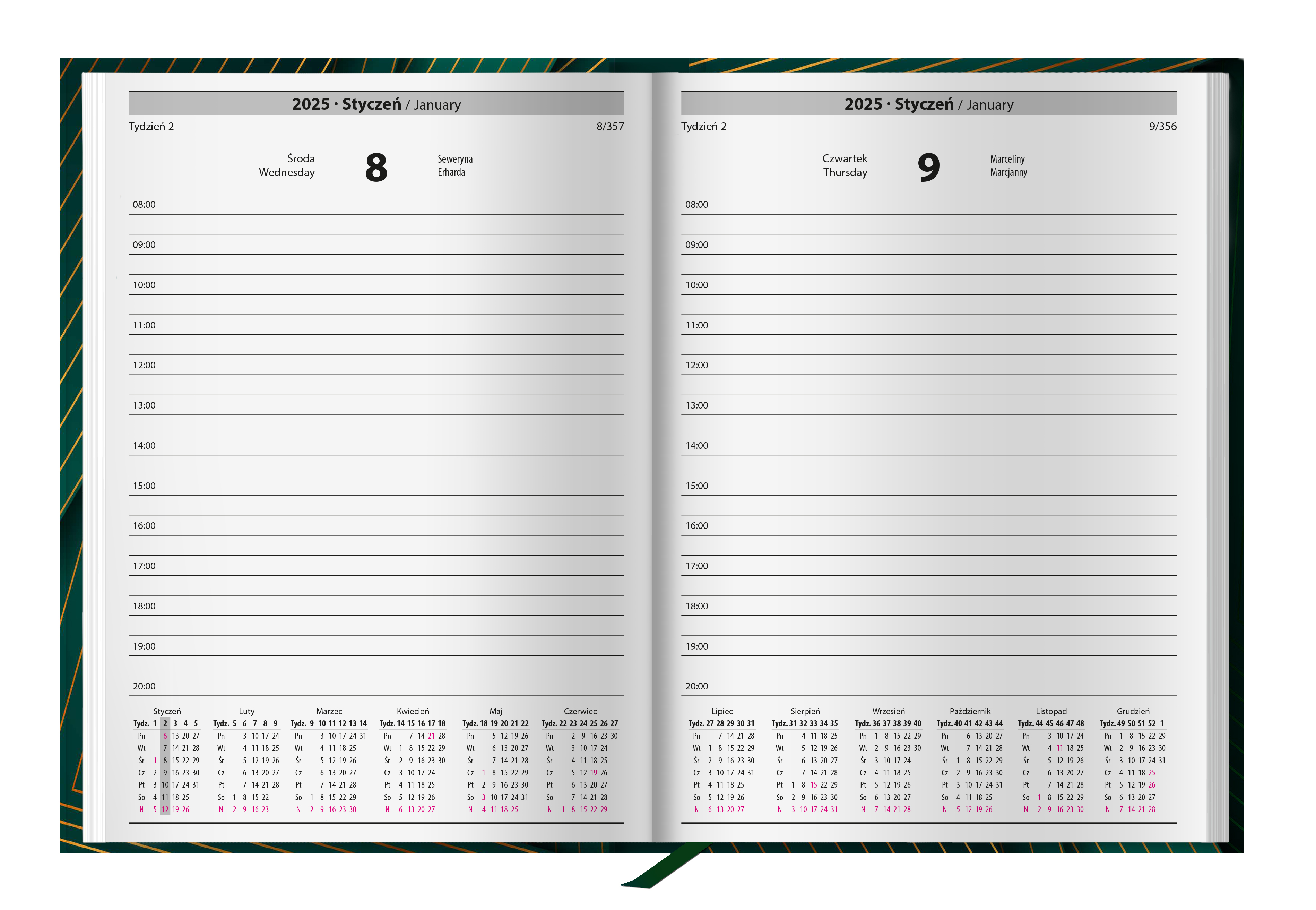 Kalendarz książkowy A5 w twardej oprawie ze wstążką.