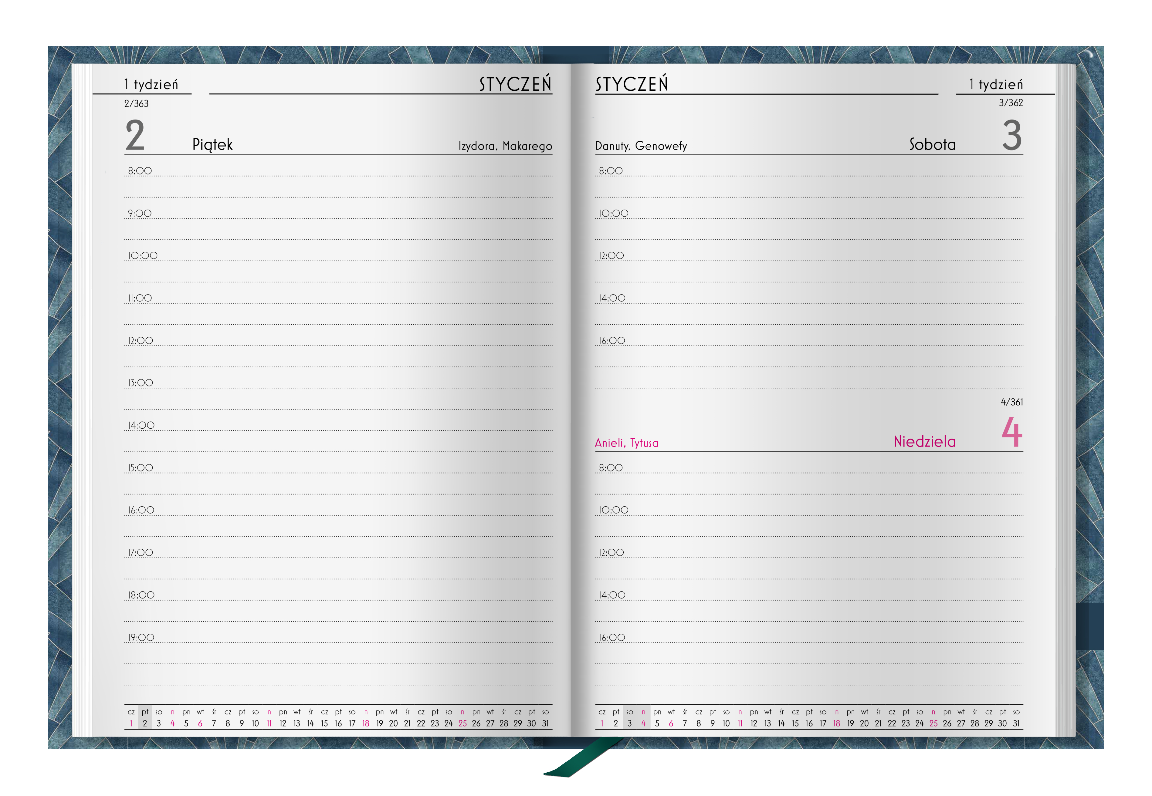 Kalendarz książkowy A5 w twardej oprawie ze wstążką.