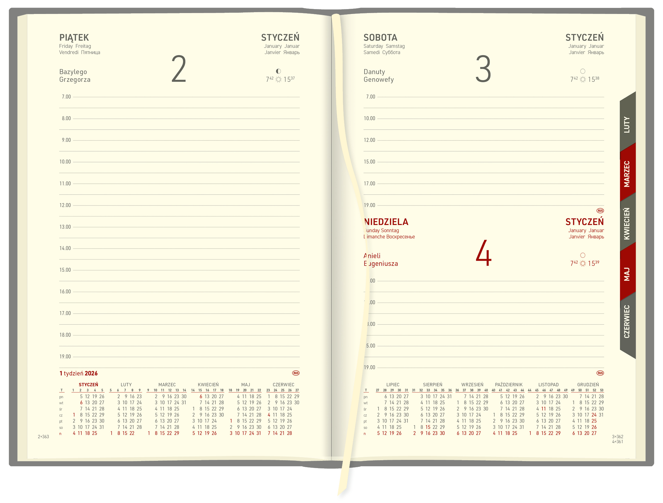 - układ: dzień na stronie, sobota i niedziela na jednej stronie
