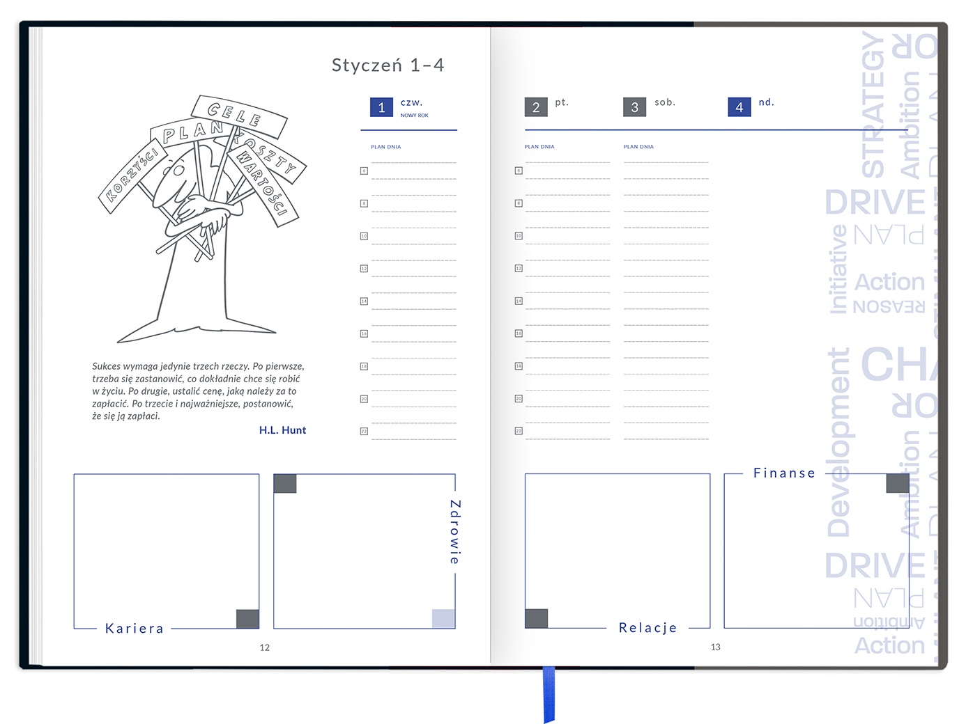Kalendarz tygodniowy 2026 inspirowany filozofią Briana Tracy’ego to połączenie klasycznego planera z praktycznym przewodnikiem rozwoju osobistego. Oprócz standardowego układu tygodniowego, zawiera ćwiczenia, refleksje i narzędzia, które wspierają w organizacji czasu, budowaniu nawyków i osiąganiu celów.