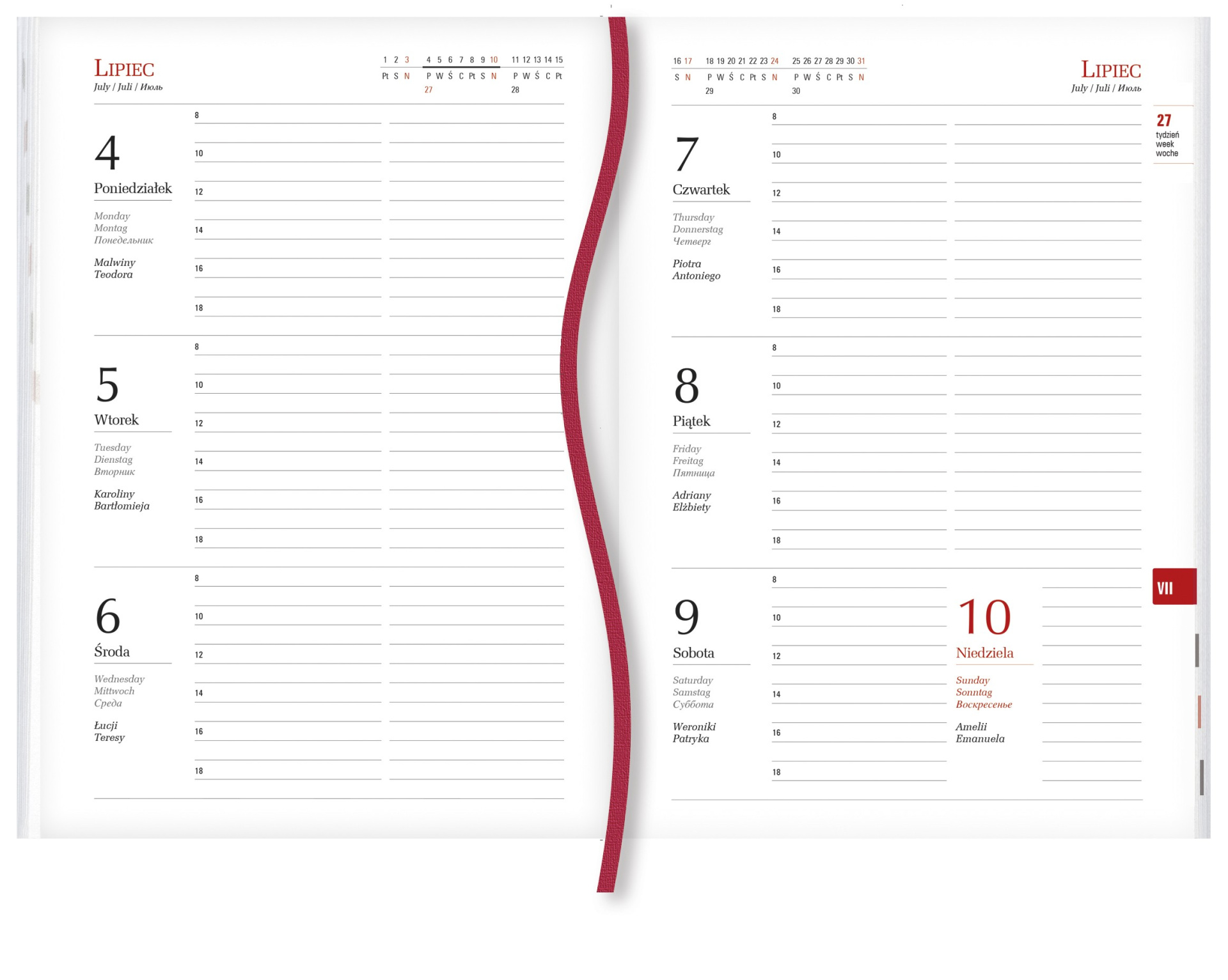układ kalendarium: 1 tydzień - 2 strony