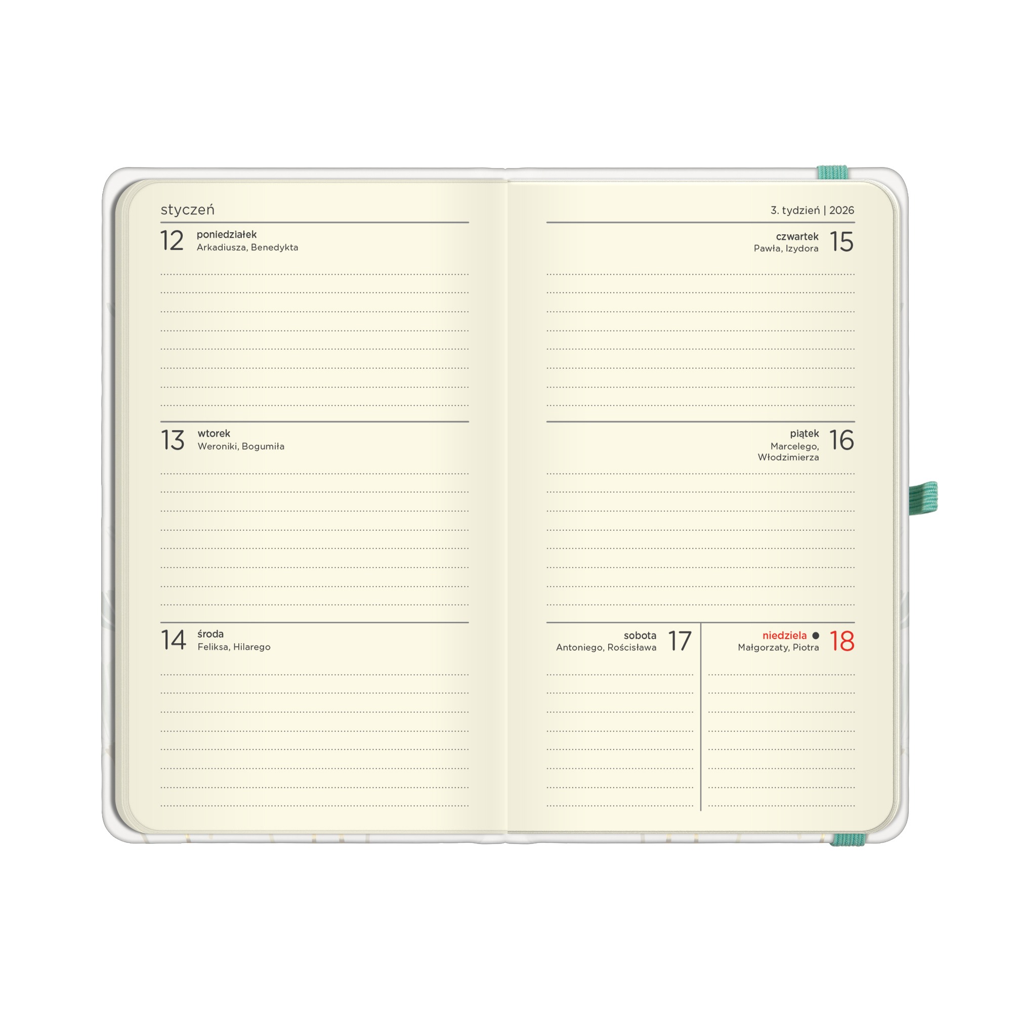 W kalendarzach na 2026 rok znajduje się również wstążka pomocna w szybkiej orientacji w kalendarzu oraz pętelka na długopis.