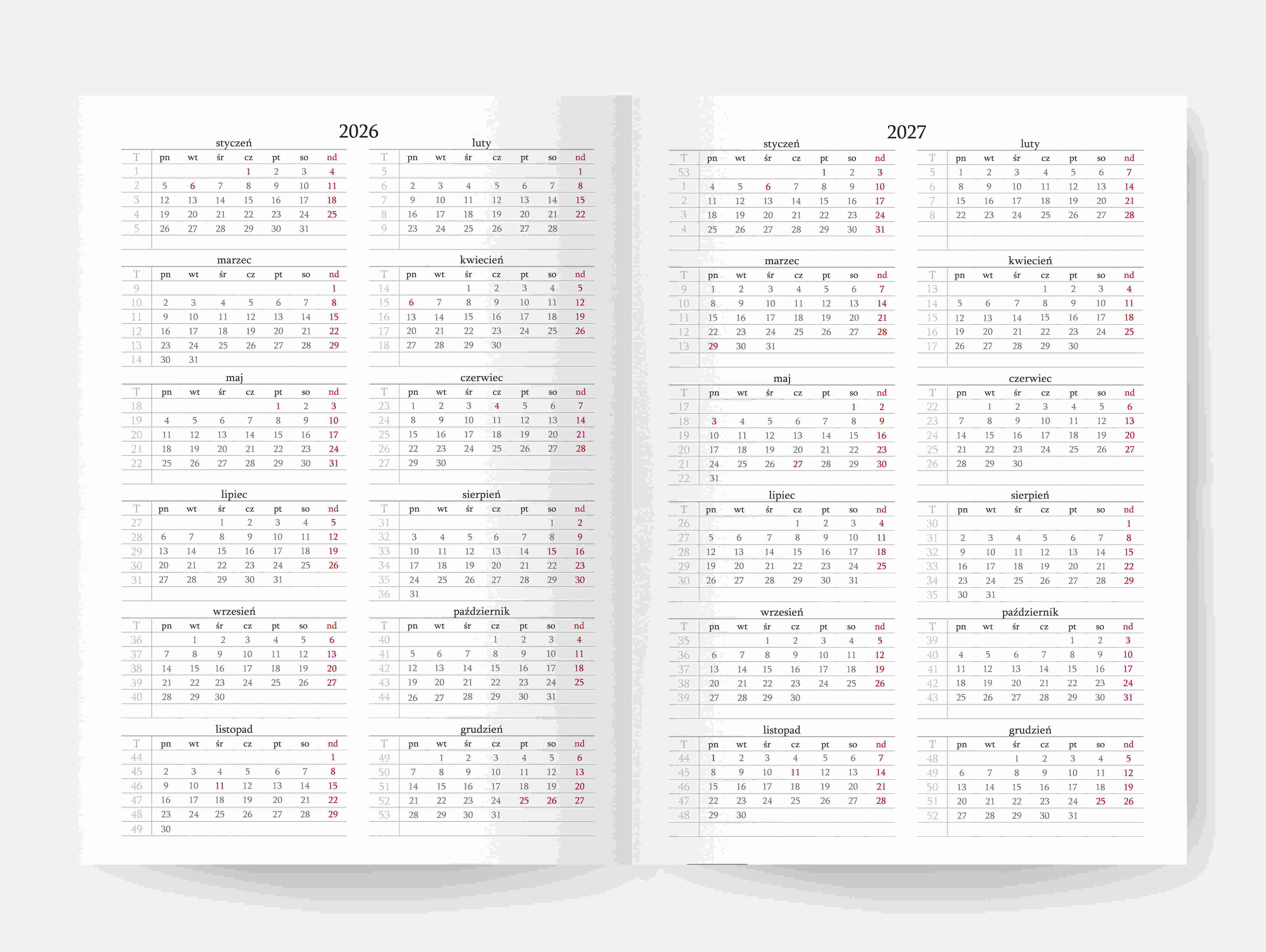 • wewnątrz: plan roku i rozkład roku 2026, terminy ferii zimowych, święta oficjalne i zwyczajowe, notes, skorowidz teleadresowy, kalendarium dodatkowe na2025-2026-2027 rok