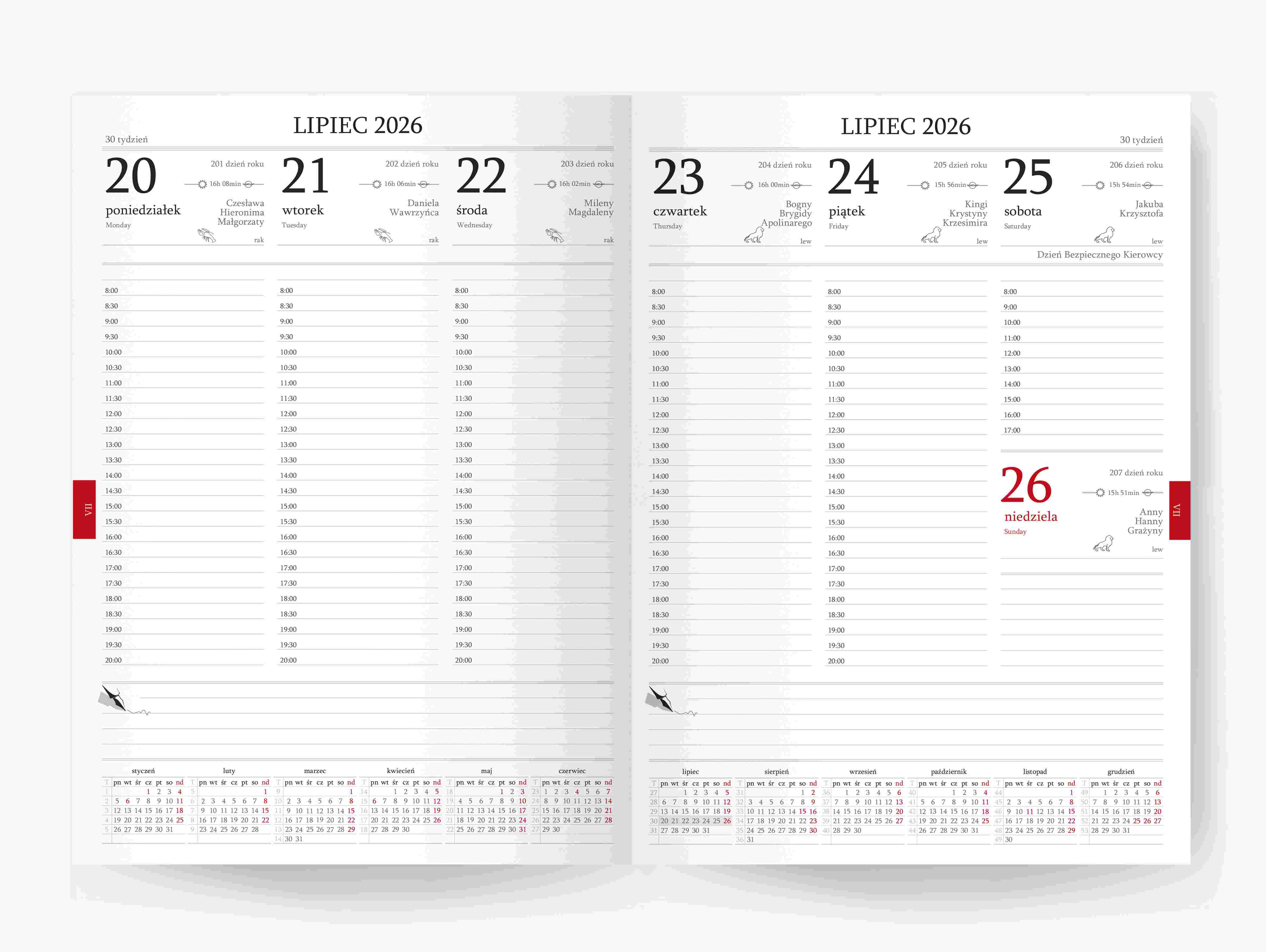 • układ: tygodniowy (tydzień na dwóch stronach)