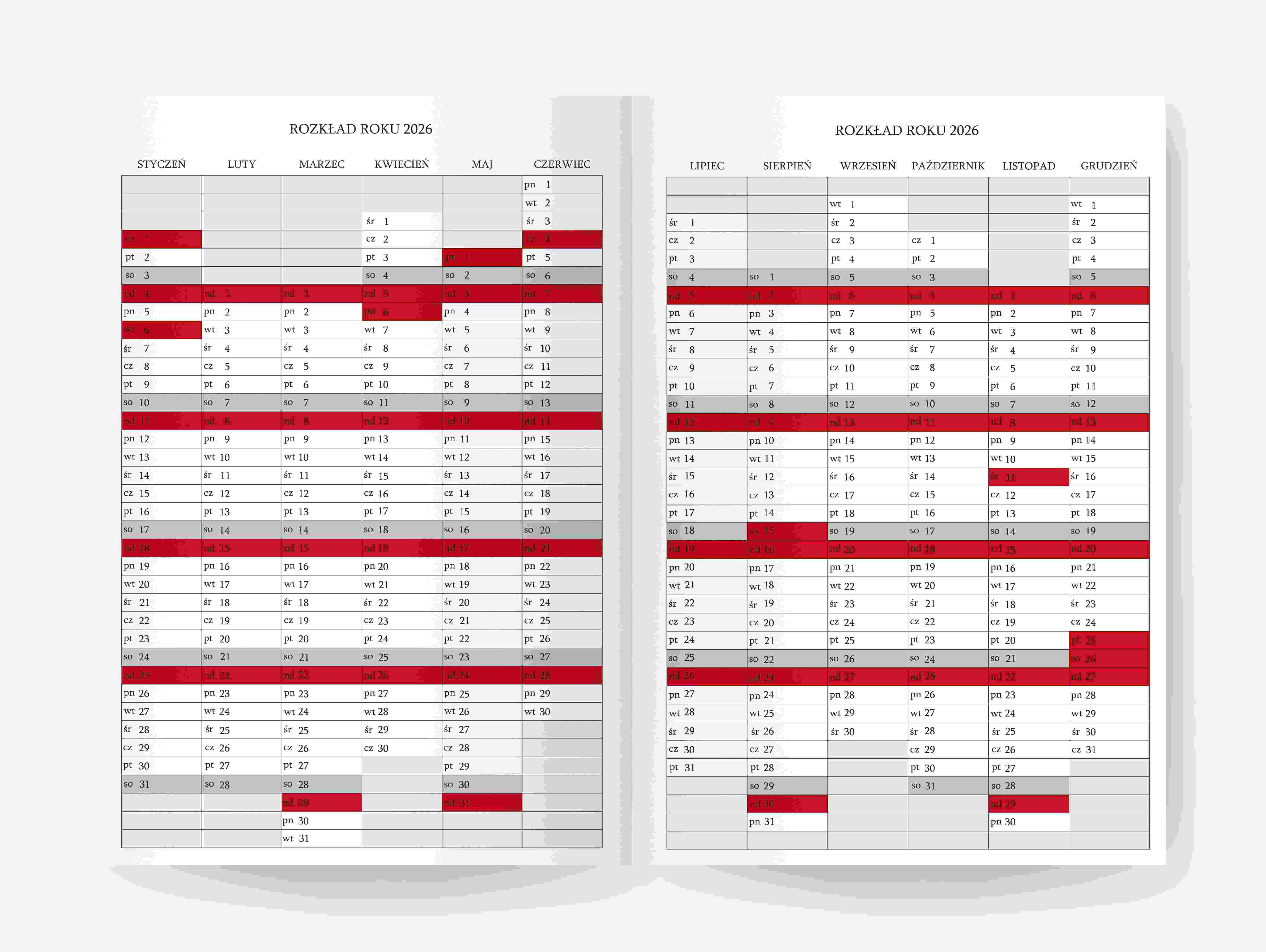 • wewnątrz: plan roku i rozkład roku 2026, terminy ferii zimowych, święta oficjalne i zwyczajowe, podróże, protokół powypadkowy w przypadku stłuczki, notes, skorowidz teleadresowy, kalendarium dodatkowe na 2025-2026-2027 rok