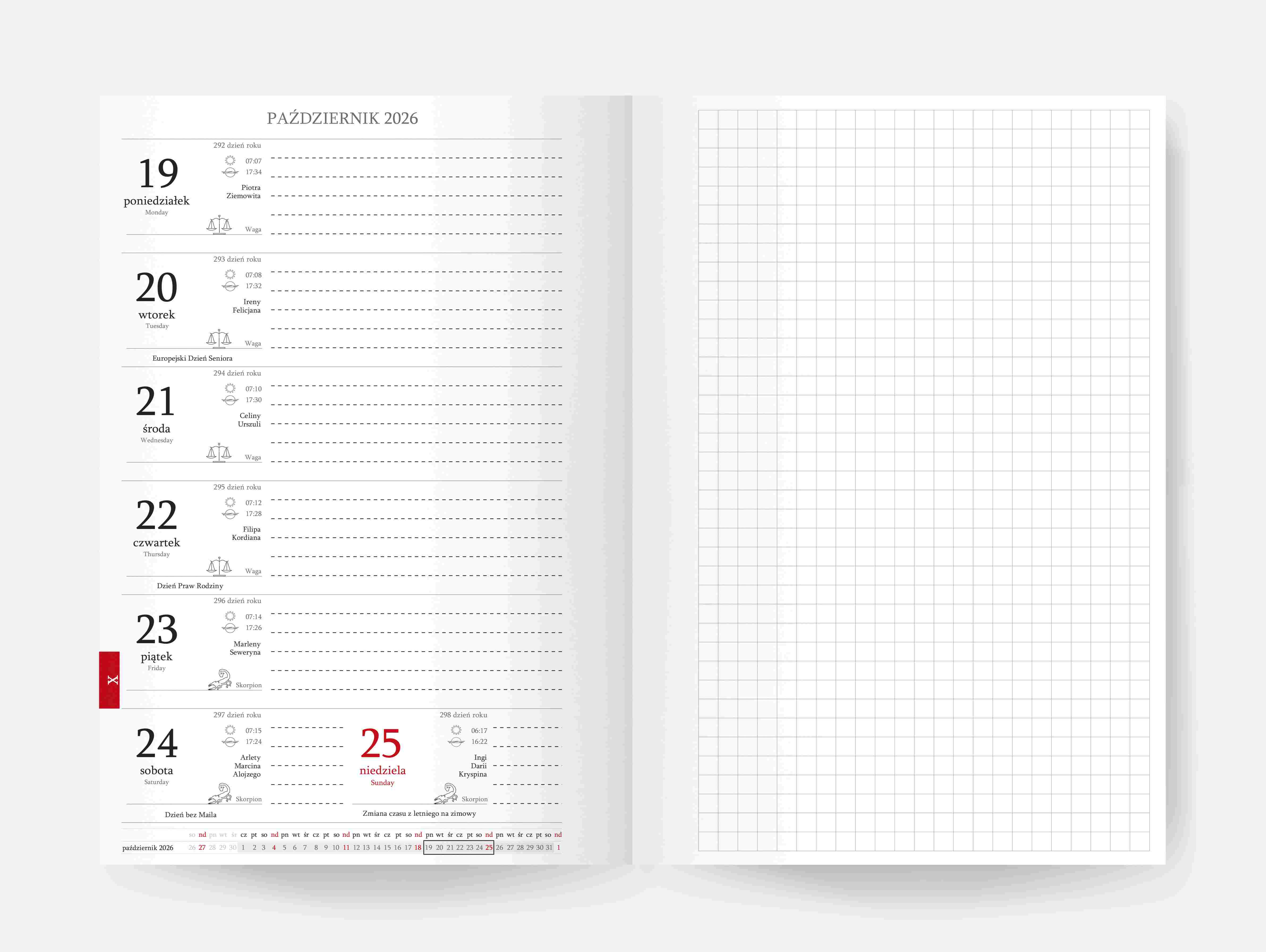 • układ: tydzień na stronie w układzie z lewej strony kalendarz tydzień na jednej stronie, a z prawej notes w kratkę