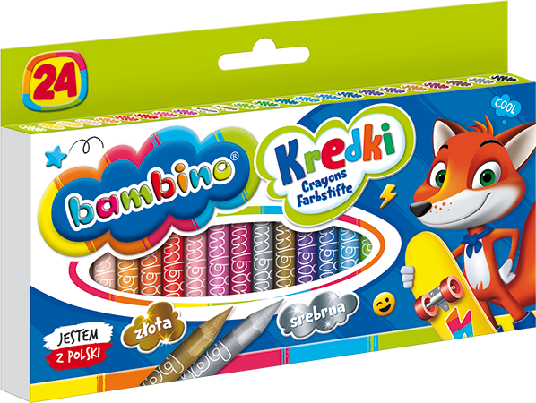 - każda kredka posiada papierową ochronną owijkę z indywidualnym motywem graficznym ułatwiającym naukę i rozpoznawanie kolorów (na każdej kredce inne zwierzątko)