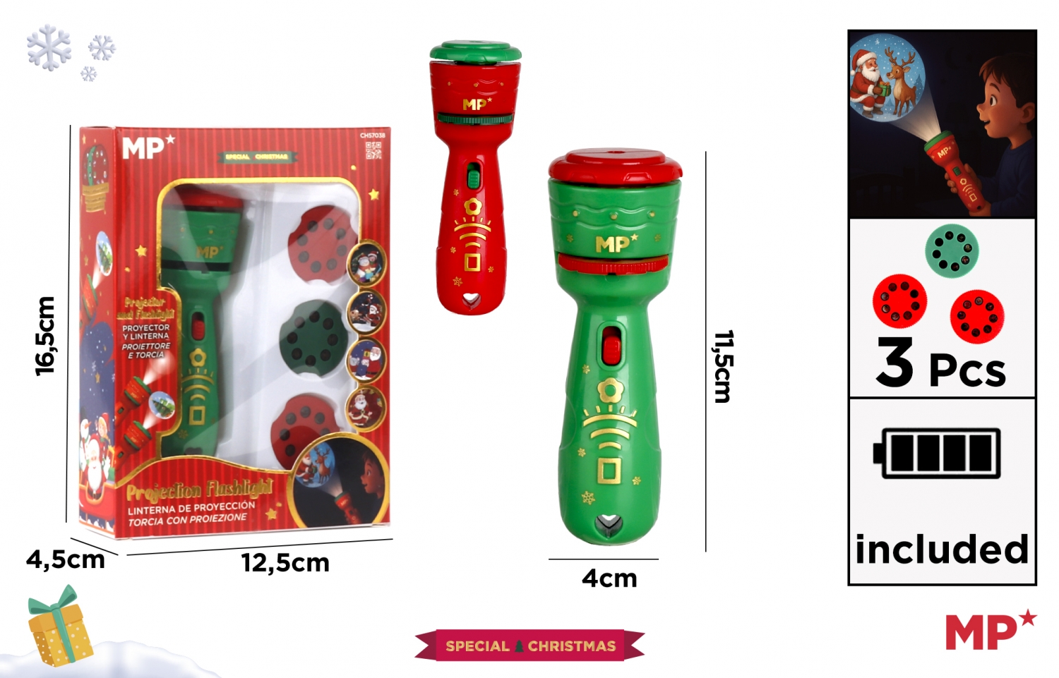 Latarka ma wymiary 10 × 5 cm. Dostarczana z 3 tarczami projekcyjnymi z nadrukowanymi motywami świątecznymi i 3 bateriami guzikowymi. Latarka, 3 dyski i baterie są umieszczone w uchwycie PET i zapakowane w kolorowe pudełko. Wykonana z tworzywa ABS, z gładkimi krawędziami dla bezpiecznego użytkowania przez dzieci. Sposób użycia: aby wymienić płytę, wystarczy podnieść plastikową pokrywę, włożyć płytę, a następnie obrócić lub dostosować jej położenie, aby wyświetlić wyświetlane obrazy. 6 pudełek w opakowaniu