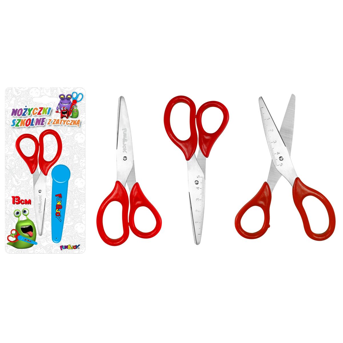 ostrze zabezpieczone plastikową zatyczką długość nożyczek 13 cm podziałka na ostrzu pakowane na blistrze dostępne dwie wersje: z niebieską lub czerwoną rączką