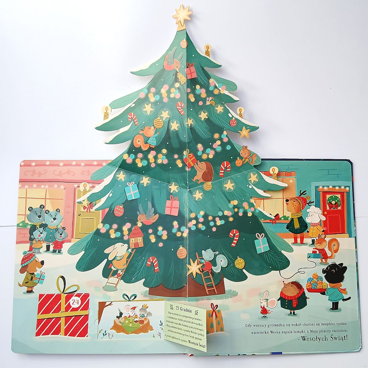 Kalendarz adwentowy z 25 okienkami edukacyjnymi i rozkładanym obrazkiem w formie dużej choinki.
