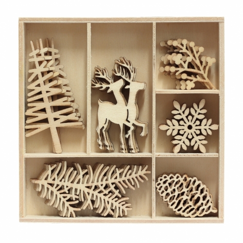 Drewniane elementy dekoracyjne świetnie nadają się do tworzenia zaproszeń, kartek okolicznościowych, pamiętników czy ozdób świątecznych. 9 wzorów w drewnianym pudełku o wymiarach 10,5 x 10,5 cm. Kształty: poinsecja, choinka, bombki, płatki śniegu, kolor: naturalny. 45 szt.