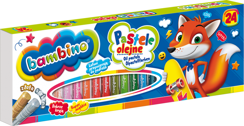 Pastele olejne Bambino idealnie sprawdzą się zarówno w domu, jaki i w szkole. Mogą być używane na papierze, kartonie czy brystolu. Znajdą zastosowanie w różnych technikach rysowania. Doskonale się rozprowadzają i kryją powierzchnię, pozwalając uzyskać subtelne efekty cieni, tła i mieszania kolorów. Wyróżnia je duża zawartość pigmentu, odporność na blaknięcie, wysoka wydajność, a także neutralny zapach. Każda pastela posiada ochronną owijkę.
