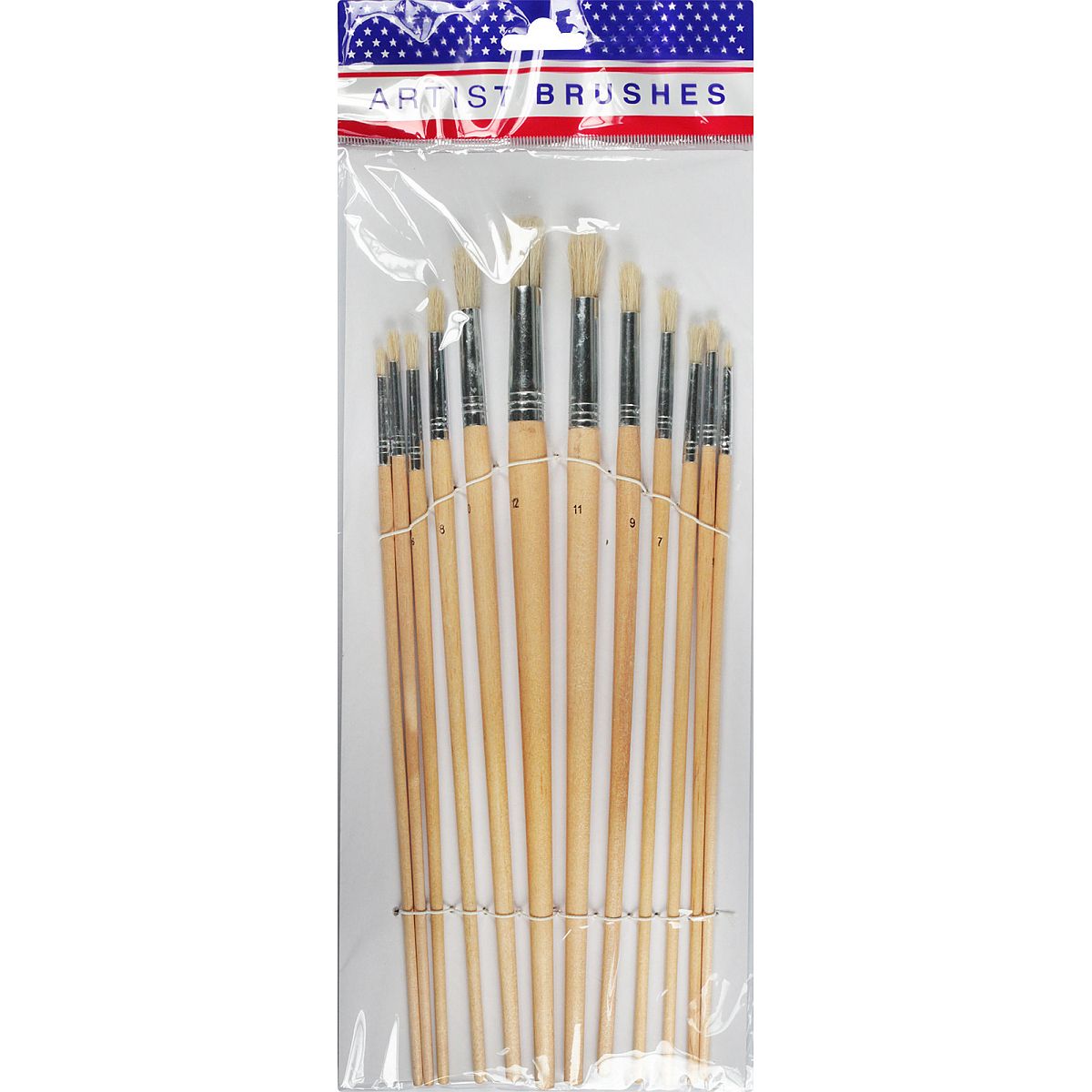 Pędzle artystyczne do farb olejnych z drewnianymi uchwytami w naturalnym kolorze. Końcówka: okrągła. Rodzaj włosia: szczecina świńska. W zestawie 12 sztuk pędzli, w rozmiarach: 1, 2, 3, 4, 5, 6, 7, 8, 9, 10, 11, 12.