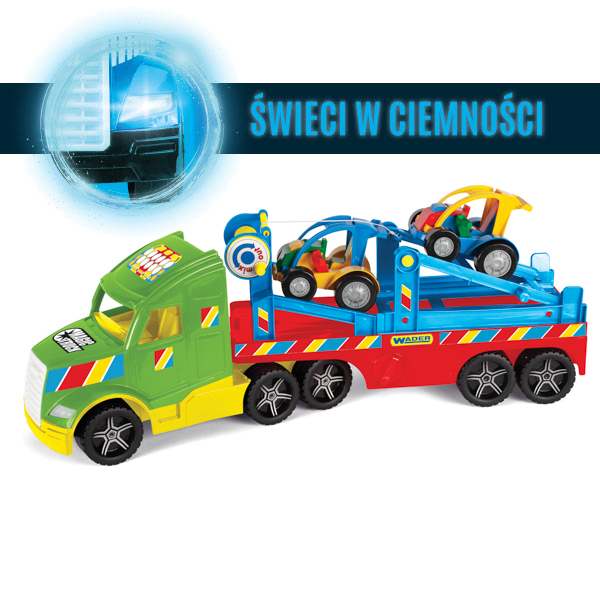 Magic Truck Basic pojazdy buggy to doskonały prezent dla najmłodszych zafascynowanych jazdą po piaszczystych bezdrożach. Ciężarówka - lora z odpinaną, skrętną naczepą może służyć do przewożenia autek typu buggy. Auto z przodu ma zamontowane fluorescencyjne światła, które po naświetleniu świecą w ciemnościach. Realistycznie odwzorowuje prawdziwy pojazd - wyposażona jest w najazdy i wciągarkę, dzięki którym samochody buggy wciągane są na lawetę. Naczepę można przyczepić do kabiny na dwa sposoby, dzięki temu auto może osiągnąć długość 110 cm. Dodatkowo posiada ona chowane nóżki podporowe, przez co może stać się samodzielnie stojącą przyczepą. W zestawie znajdują się 2 autka buggy. Całość wykonana jest z wysokiej jakości, trwałego i wytrzymałego tworzywa sztucznego odpornego na różne warunki atmosferyczne, co pozwala na zabawę oraz przechowywanie zabawki zarówno w domu, jak i na dworze. Magic Truck Basic pobudza wyobraźnię dziecka, pomaga doskonalić jego rozwój motoryczny i umiejętności manualne, a fluorescencyjne elementy pobudzą ciekawość. Do twórczej zabawy i jazdy po pustynnych bezdrożach dziecko może zaprosić swoje rodzeństwo bądź kolegów i koleżanki. Zabawa w grupie pozwoli nawiązać dziecku relacje społeczne, poznać strukturę i zasady, jakie panują w grupie oraz nauczyć się współpracy.