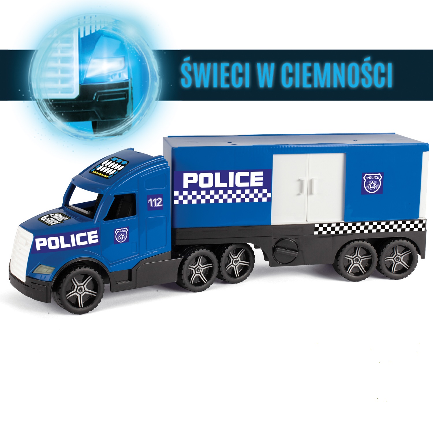 Magic Truck Action – Policja w kolorze niebieskim z białymi akcentami posiada skrętną skrzynię ładunkową, którą można przyczepić do pojazdu na 2 sposoby. Kontener posiada rozsuwane drzwi boczne oraz otwieraną tylną klapę, dzięki którym można do niego ładować różne przedmioty. Naczepa posiada wysuwane nóżki podporowe, które pozwalają stworzyć z niej samodzielną przyczepę. Auto z przodu ma zamontowane fluorescencyjne światła, które po naświetleniu świecą w ciemnościach. Pojazd wykonany jest z materiałów bezpiecznych dla dzieci. Ogromną zaletą jest trwałość i wytrzymałość konstrukcji, co sprawia, że zabawka może służyć dzieciom latami.