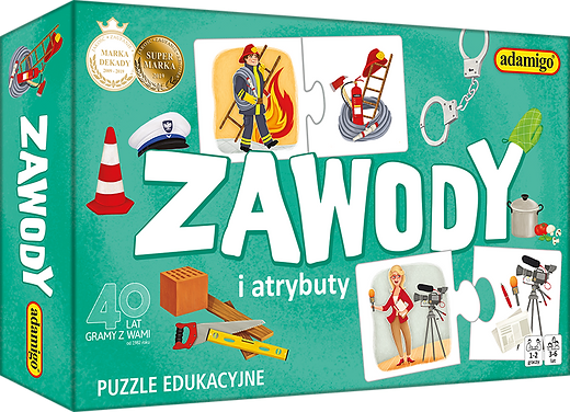 Zestaw zawiera 24 puzzle, z których można ułożyć 12 obrazków przedstawiających zawody i atrybuty.