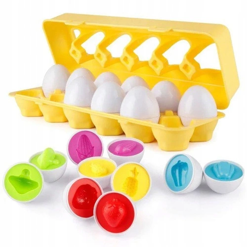Jajka Edukacyjne to zestaw 12 kolorowych jajek zaprojektowanych z myślą o wspieraniu rozwoju dziecka poprzez zabawę i naukę. Każde jajko składa się z dwóch połówek, które należy dopasować do siebie według koloru oraz kształtu znajdującego się wewnątrz. Zestaw zamknięty jest w praktycznej, plastikowej wytłaczance przypominającej prawdziwe opakowanie na jajka, co dodaje realizmu i uczy porządku.