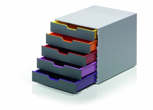 Stylowy i innowacyjny pojemnik z 5-cioma kolorowymi szufladami z wysokiej jakości tworzywa sztucznego. Delikatne kolorowe linie na brzegach frontów szuflad są pomocne przy porządkowaniu dokumentów. Cicho i lekko wysuwające się szuflady posiadają blokady. Szuflady przeznaczone na dokumenty do formatu A4, C4 oraz mniejszych rozmiarów jak Folio oraz A5. Na frontach szuflad znajdują się przezroczyste okienka z etykietami, które można opisać także komputerowo. Etykiety wymienia się w prosty sposób. Pojemniki można wykorzystywać we wszystkich standardowych regałach oraz szafach biurowych. Można je także ustawiać jeden na drugim dzięki antypoślizgowym stopkom z tworzywa .