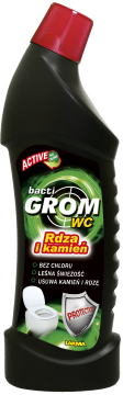 BactiGROM – Active to nowoczesny preparat, który dzięki recepturze opartej na kwasie przeznaczony jest do usuwania kamienia oraz rdzy. Produkt nie zawiera chloru. Po wyczyszczeniu pozostawia w toalecie leśny zapach. Preparat pomaga usuwać nagromadzone osady organiczne oraz najtrudniejsze osady kamienia.